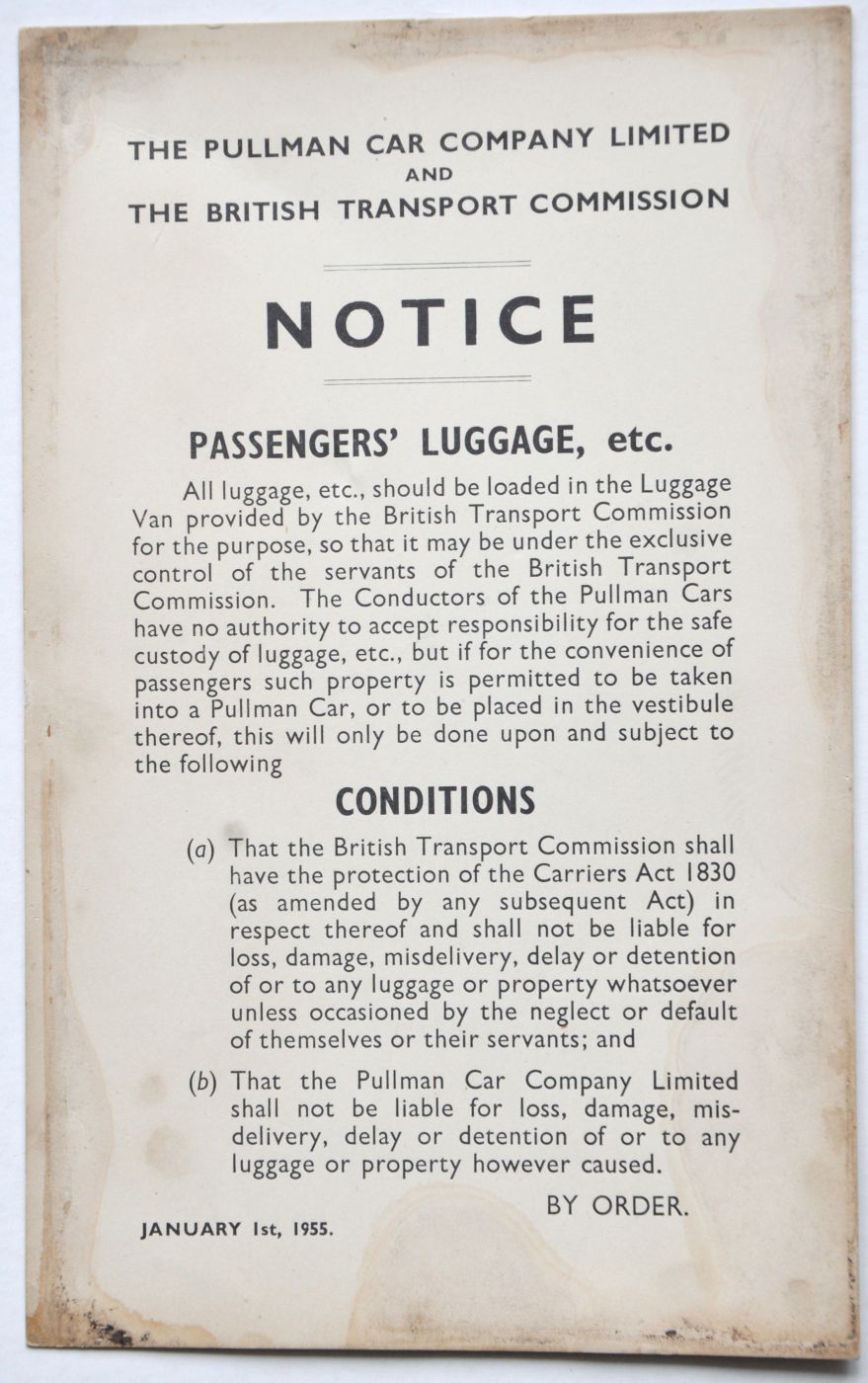 Category: PaperworkPULLMAN CAR COMPANY and BTC 8" x 5" card notice re passengers luggage. Dated January 1955. Marked at edges. £10 | |