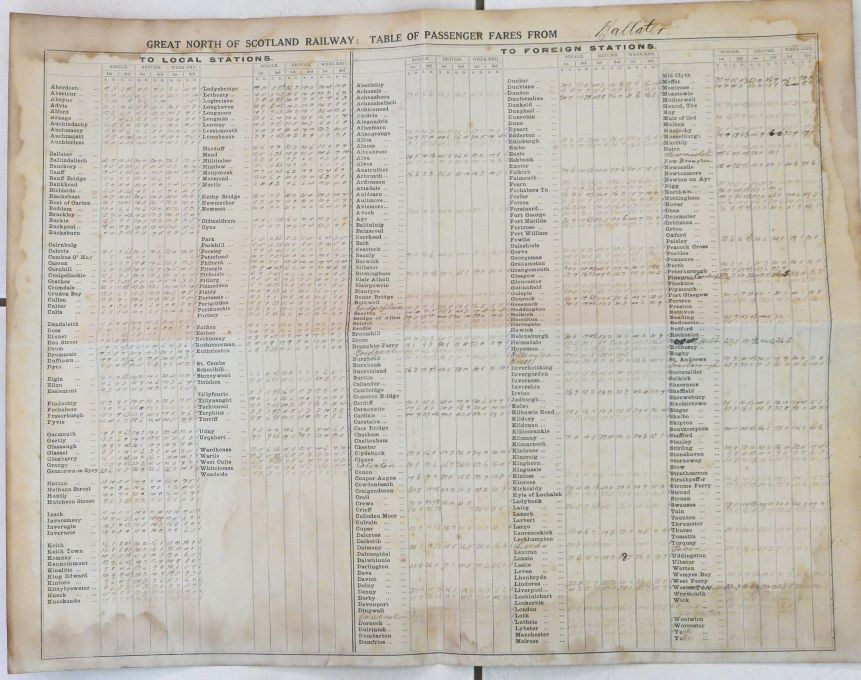| Lot 115 | Category: PaperworkGNSR poster type part hand written list of passenger fares from Ballater circa 1910s. Approx 24" x 19", well used and with damp staining to edges. £10 |