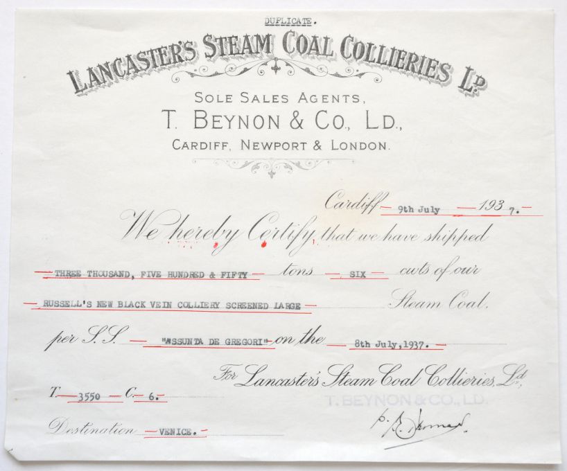 | Lot 116 | Category: PaperworkLANCASTER'S STEAM COAL COLLIERIES LIMITED certificate for the shipment of 3550 tons of Russell's New Black Vein large steam coal from Cardiff to Venice in July 1937. Ornate title, good condition. £10 |