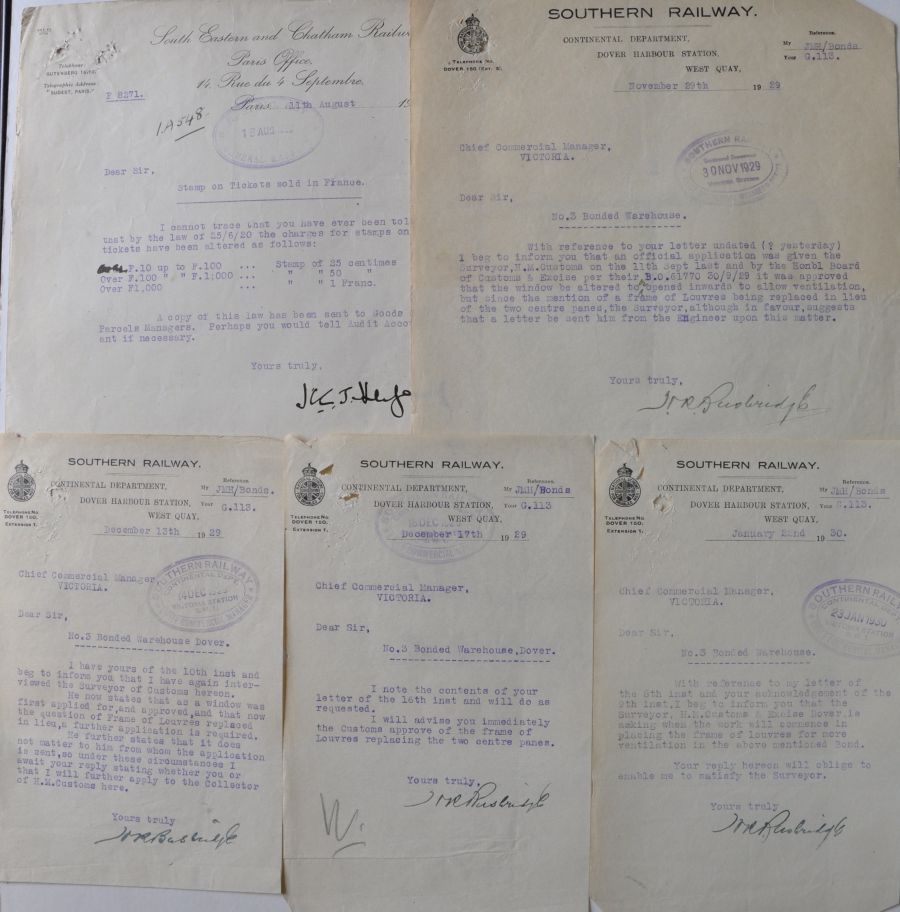 Category: PaperworkAPPROX 100 mostly SR items of correspondence from various departments involved in continental traffic operations. Most relate to port traffic and baggage. Includes one SECR headed letter from the Paris office. (Qty) £10 | |