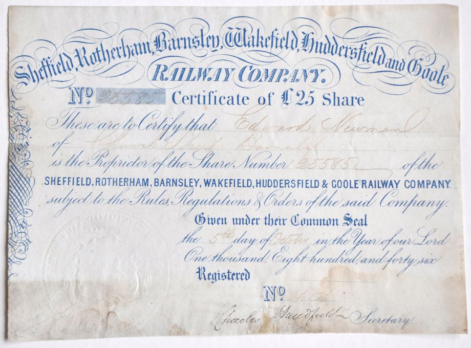 Lot 123 | Category: Share CertificatesSHEFFIELD, ROTHERHAM, BARNSLEY, WAKEFIELD, HUDDERSFIELD AND GOOLE RAILWAY share certificate for one £25 share dated 1846. Ornate scrolled title, embossed seal, blue print, not cancelled. Marked at bottom edge. £10 |