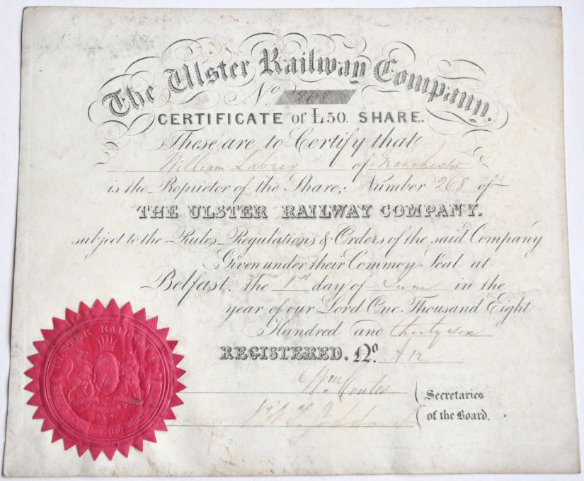 | Lot 124 | Category: Share CertificatesULSTER RAILWAY share certificate for one £50 share dated 1836. Ornate design on vellum with attached red coloured embossed seal. Not cancelled. £10 |