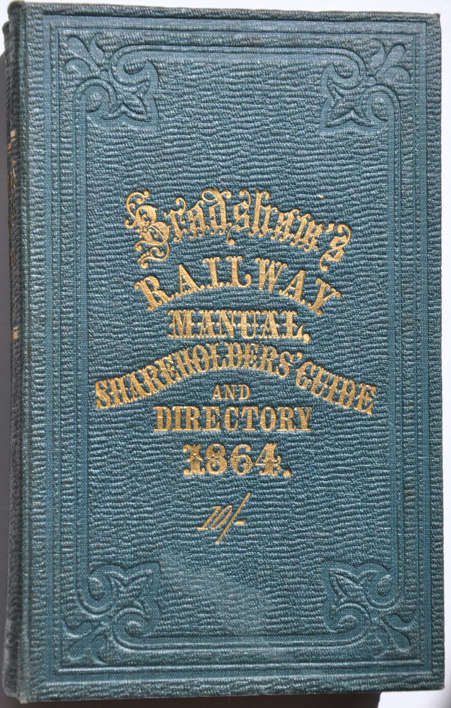 Category: BooksBRADSHAW'S RAILWAY MANUAL, SHAREHOLDER'S GUIDE AND DIRECTORY dated 1864. Green coloured clothbound hardback covers with title in gold on front and spine, 595pp plus one fold out map. £10 | |