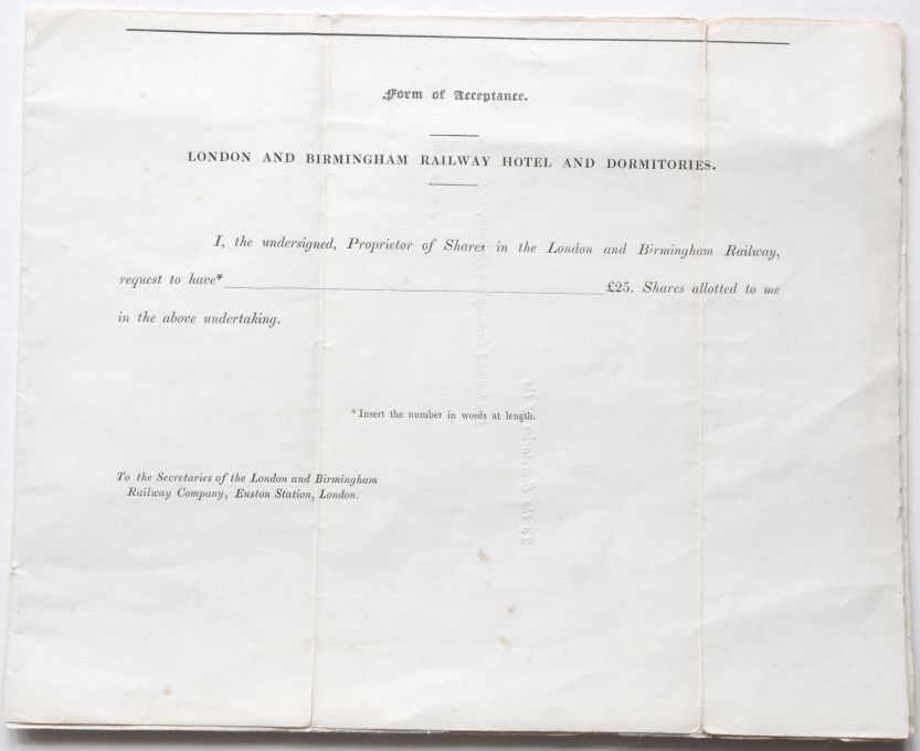 | Lot 142 | Category: Early and Historical PaperworkLONDON AND BIRMINGHAM HOTEL AND DORMITORIES prospectus dated 1838. 8pp fold out type showing engraving of Euston arch. Unfortunately torn into two halves along the fold. £50 |