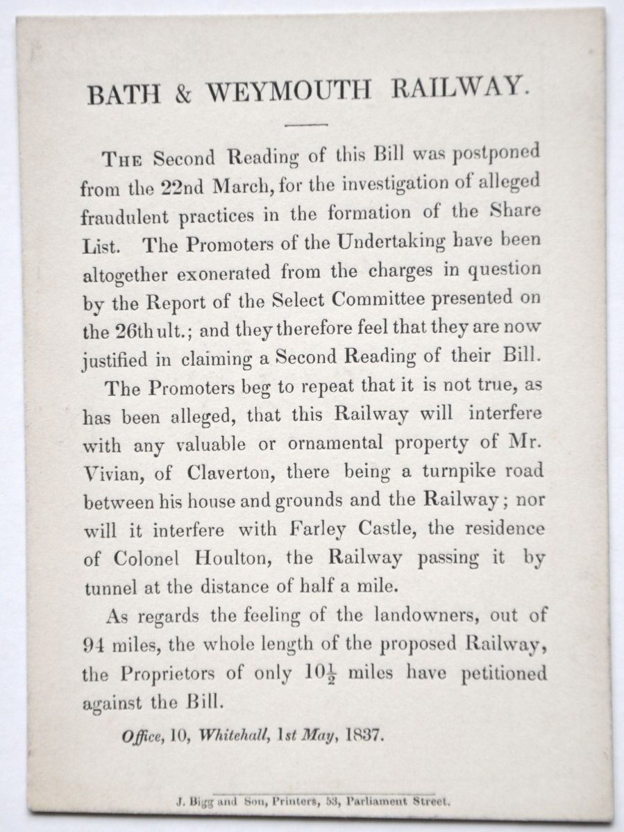 Category: Early and Historical PaperworkBATH & WEYMOUTH RAILWAY pocket sized thin card notice re the second reading of the bill and petitions against it. Dated May 1837. £10 | |