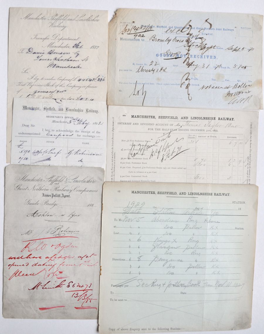 Category: Early and Historical PaperworkApprox 30 MANCHESTER, SHEFFIELD AND LINCOLNSHIRE RAILWAY paperwork items. Good variety, most used. (Qty) £10 | |