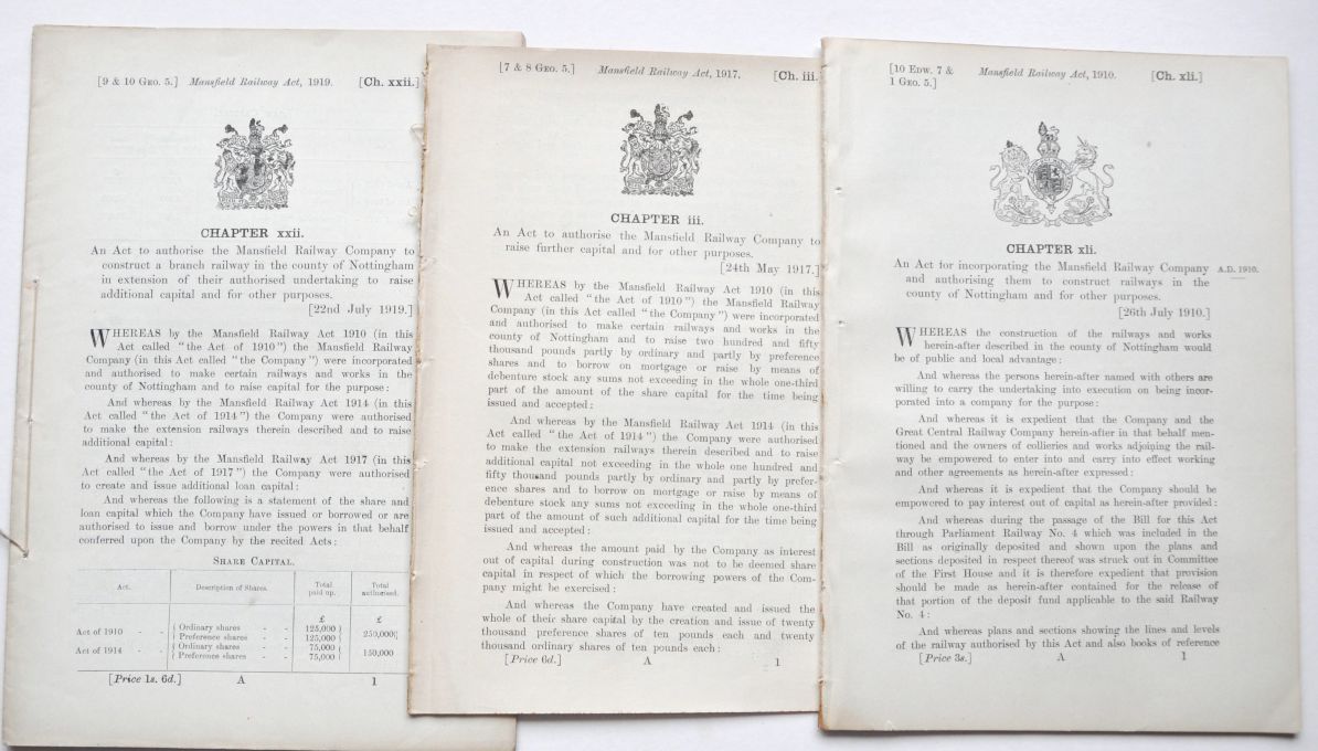 Lot 156 | Category: Acts of ParliamentThree acts relating to the MANSFIELD RAILWAY. Approx 65pp dated 1910 - 1919. Disbound. £10 |
