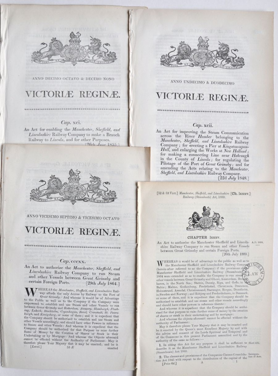 Category: Acts of ParliamentSeven acts relating to the MANCHESTER, SHEFFIELD AND LINCOLNSHIRE RAILWAY. Approx 100pp dated 1848 - 1904. Disbound. £10 | |
