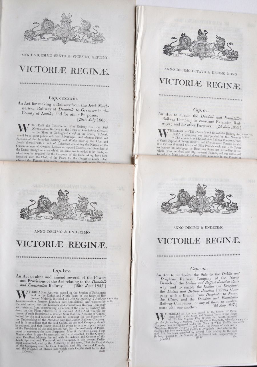 Category: Acts of ParliamentIRELAND. Six acts relating to the Dundalk and Enniskillen Railway. Dated 1847 - 1863. 40+pp in total, disbound. £10 | |