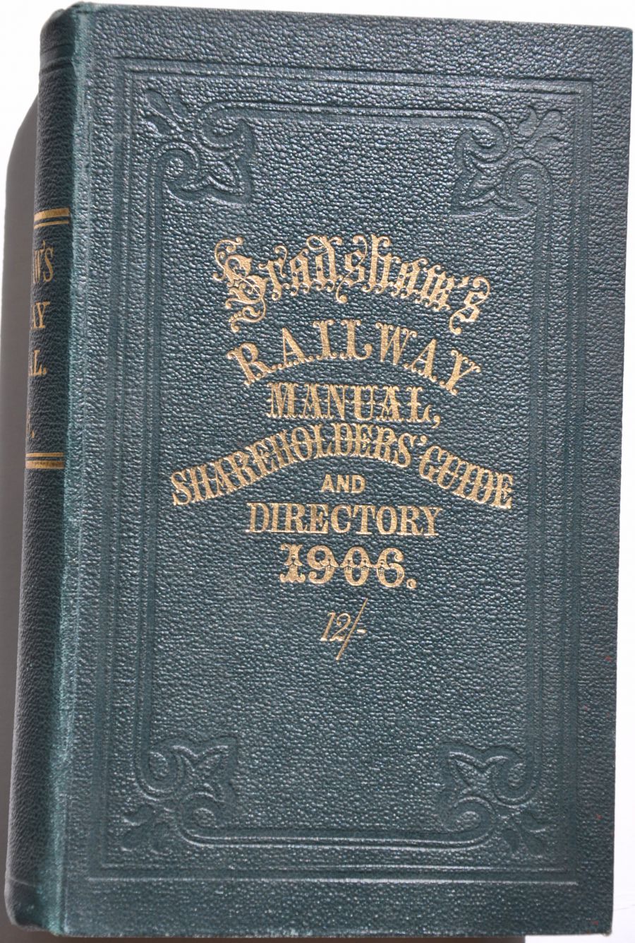 Category: BooksBRADSHAW'S RAILWAY MANUAL, SHAREHOLDER'S GUIDE AND DIRECTORY dated 1906. Green coloured clothbound hardback covers with title in gold on front and spine, 654pp plus fold out maps. £10 | |