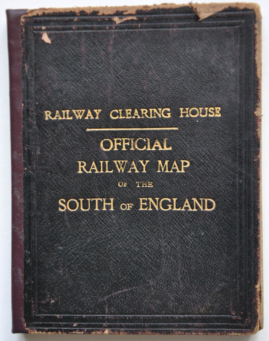 Category: Maps, RCH unless statedRAILWAY CLEARING HOUSE MAP of the South of England dated 1906. Dmf into hardback covers with title in gold on front. Covers rubbed, spine replaced, map OK. £30 | |