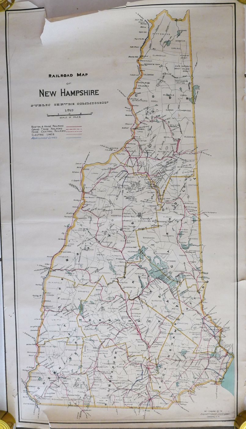 Category: MapsPUBLIC SERVICE COMMISSION "Railroad Map of New Hampshire". Coloured map on paper, approx 30" x 18", dated 1919. Several small edge tears. £10 | |