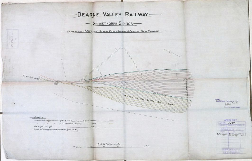 Lot 194 | Category: PlansDEARNE VALLEY RAILWAY plan of Grimethorpe Sidings. Approx 26" x 18" on linen, part coloured, dated 1912. Folded. £10 |