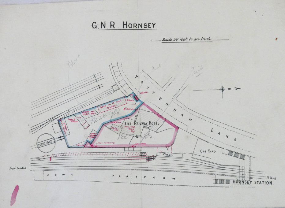 | Lot 196 | Category: PlansGNR plan of the Railway Hotel, Hornsey. Approx 14" x 10" on paper, 50ft to 1" coloured to show the building and yard. Probably a rating plan. Undated, folded. £10 |