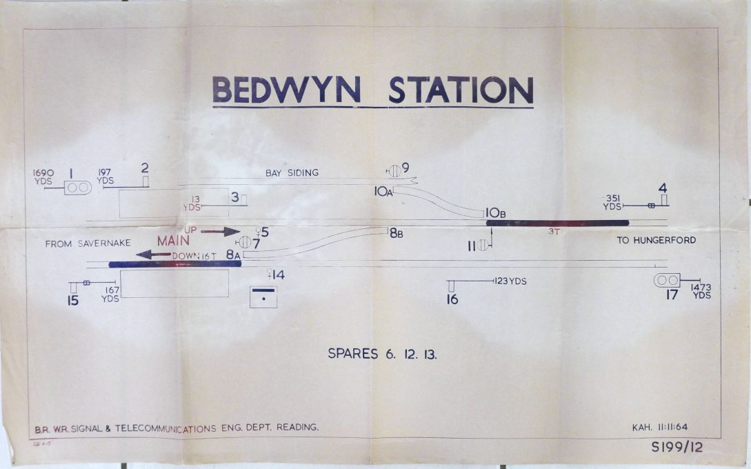 | Lot 220 | Category: Signal Box DiagramsBR(W) S&T Engineer's office copy signalbox diagram from Bedwyn Station signalbox. Dated 1964. Folded, some fading. £10 |