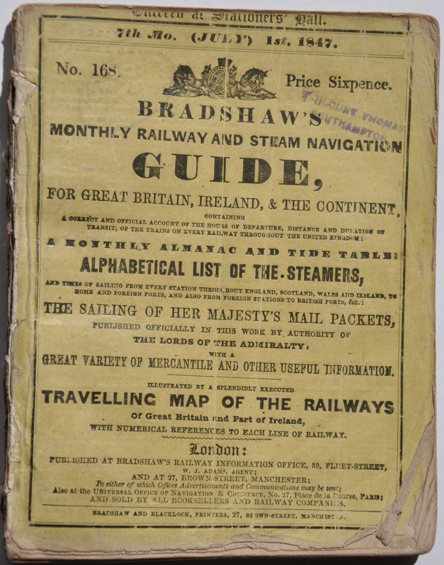 Category: Timetables (Bradshaw)BRADSHAW'S RAILWAY AND STEAM NAVIGATION GUIDE dated July 1847. Yellow paperback covers, 108pp plus adverts, disbound causing a little spine damage. £10 | |
