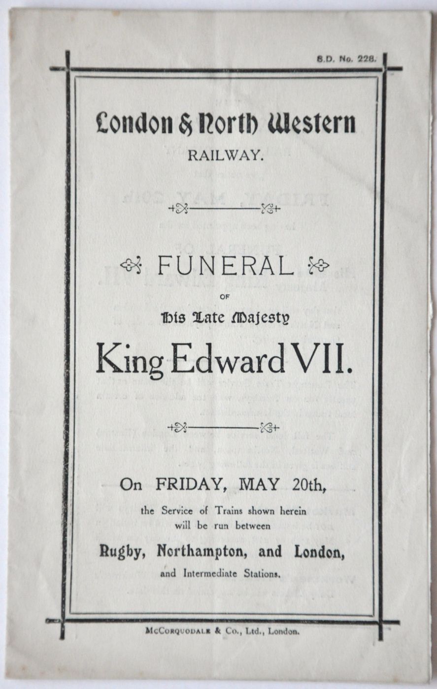 Category: Timetables (Public)LNWR 8pp PTT for services between Rugby, Northampton and London for the funeral of King Edward VII on May 20th 1910. £10 | |