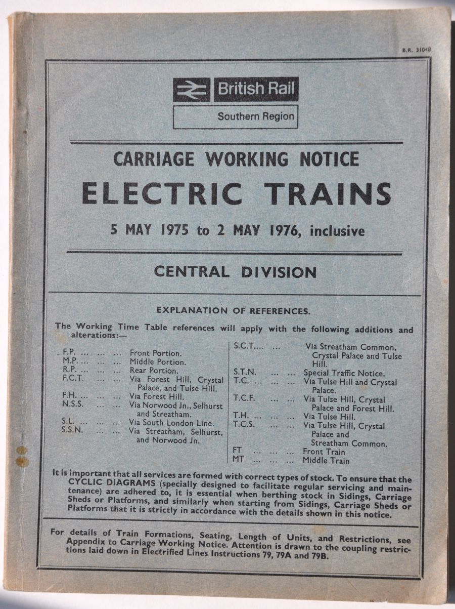 Category: Carriage Working and RecordsBR(S) Central Division "Carriage Working Notice Electric Trains". Blue covers, 228pp dated May 1975. Covers faded. £10 | |