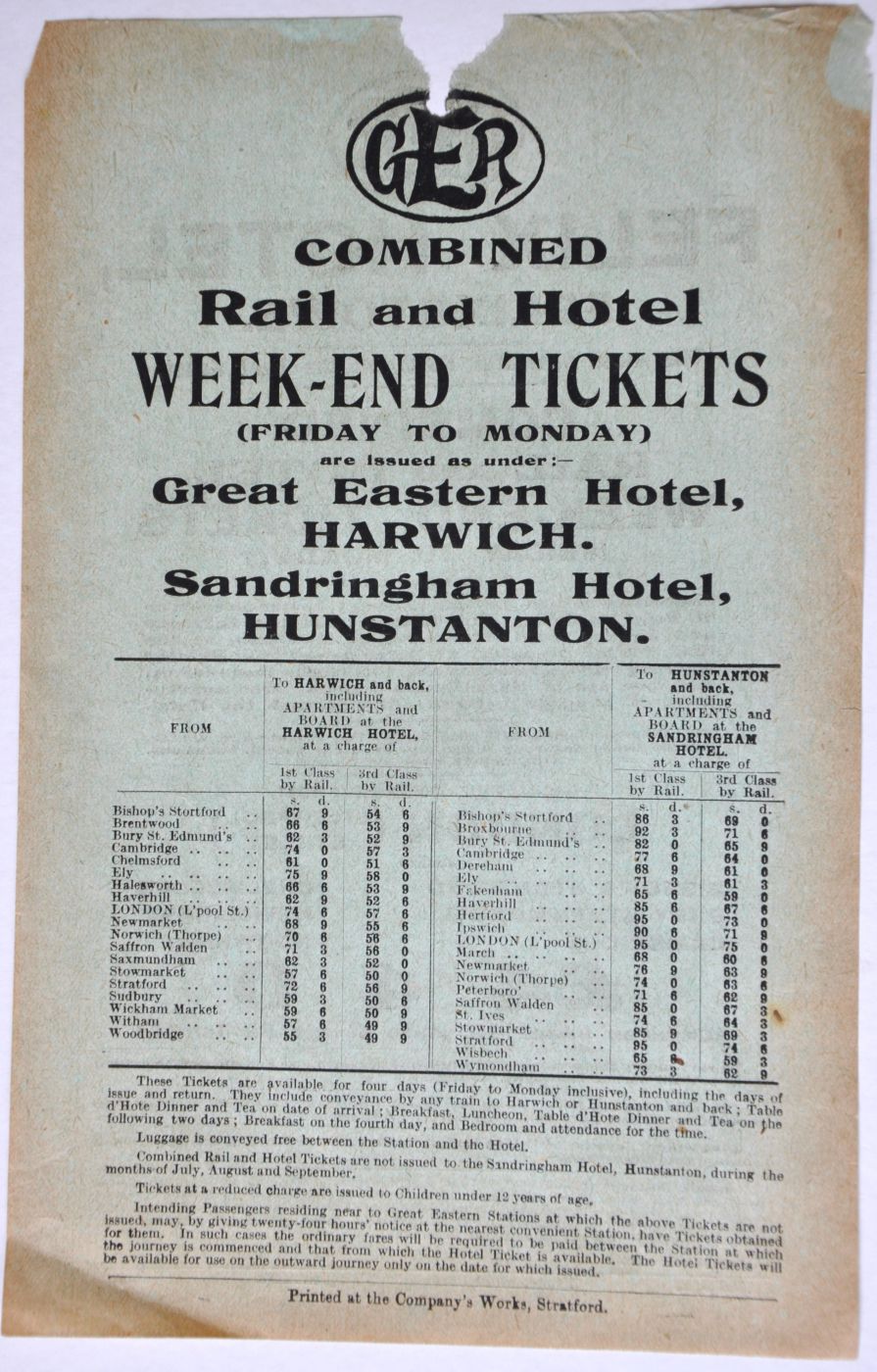 Category: HandbillsGER handbill for combined rail and hotel weekend tickets to the Great Eastern Hotel Harwich and Sandringham Hotel Hunstanton listing fares from various East Anglian stations. Printed on green paper, dated September 1922. Faded at edges, small string tear. £10 | |