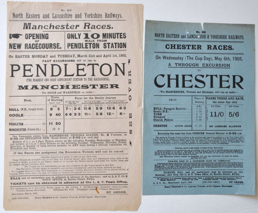 Lot 282 | Category: HandbillsNER & L&YR joint handbill for excursion from Hull to Chester for Chester Races. Printed on blue paper, dated May 1903. Plus similar to Pendleton for Manchester Races dated March 1902. (2) £10 |