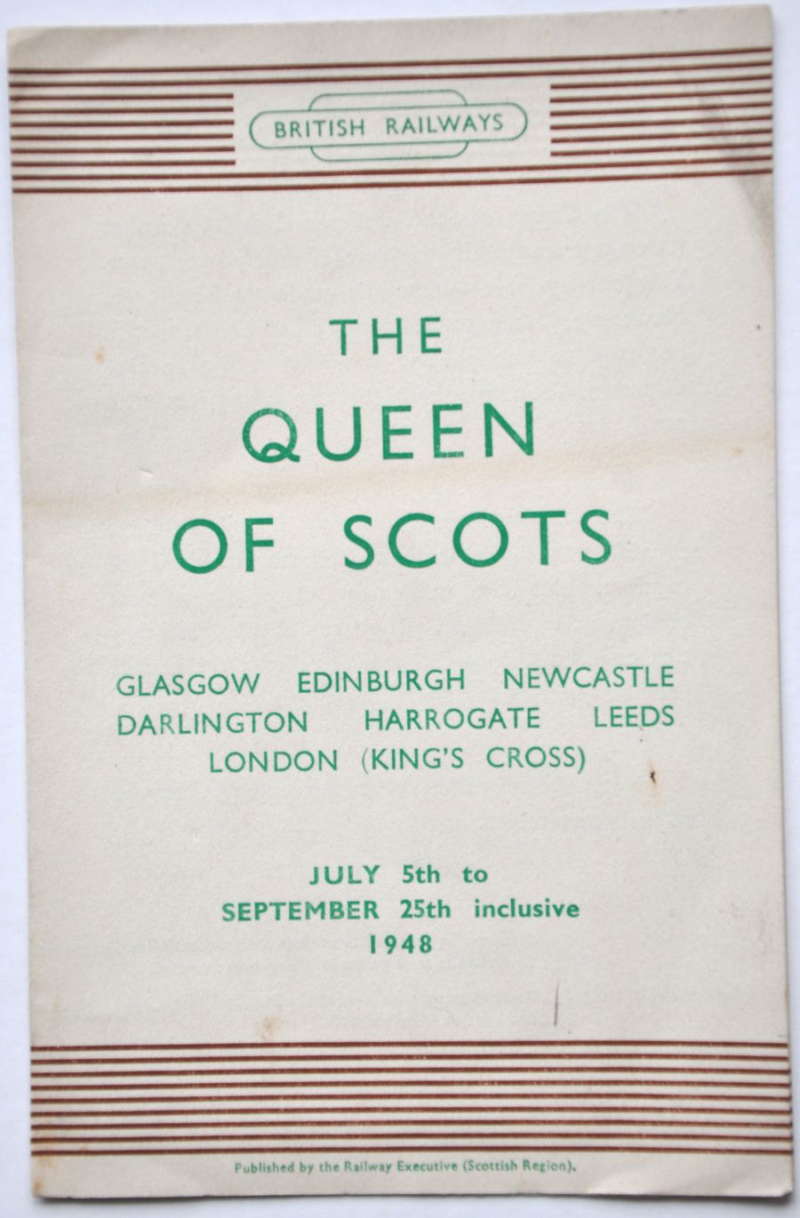 Category: Publicity MaterialBR 4pp named train leaflet for the Queen of Scots train. Green and brown print detailing times and showing route map. Dated July 1948. Minor wear. £5 | |