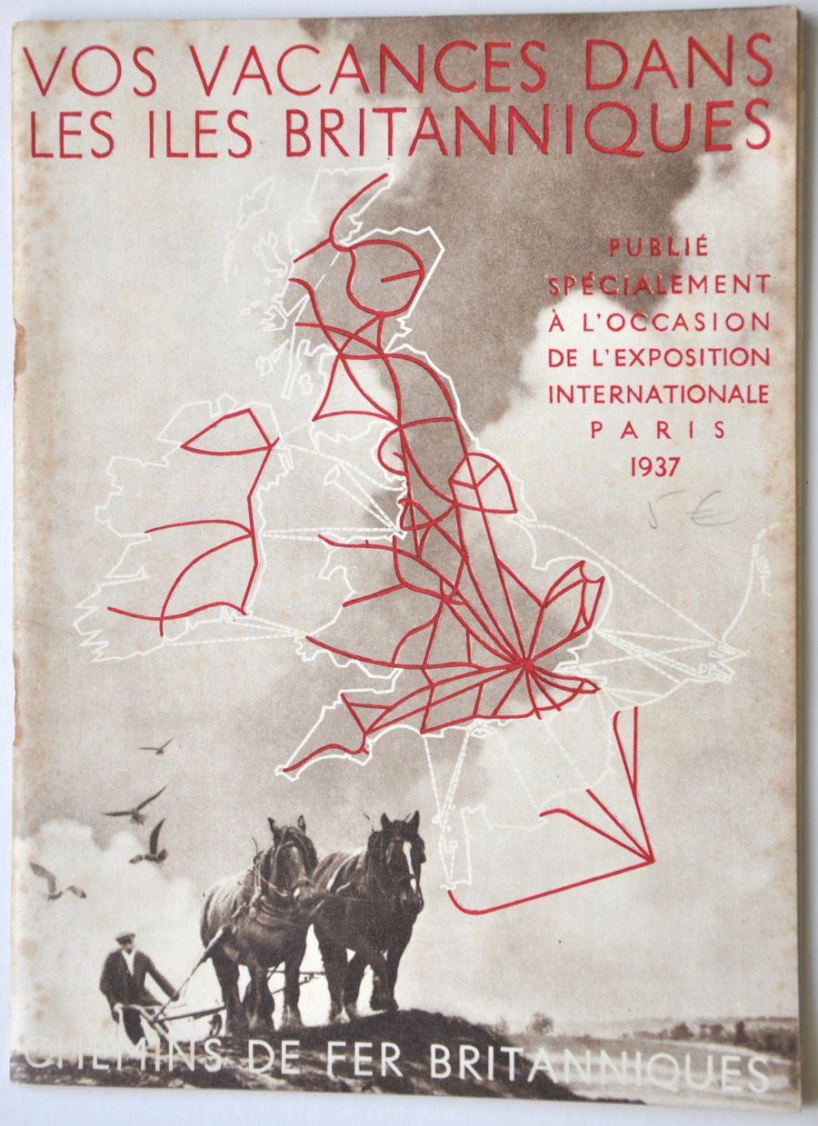 Category: Publicity MaterialBRITISH RAILWAYS published 32pp brochure "Vos Vacances dans les Iles Britannique". Photo and artwork type pictorial covers, illustrated guide with fold out map. Produced for the International Exposition in Paris in 1937 with text in French. Rusty staples removed. £10 | |