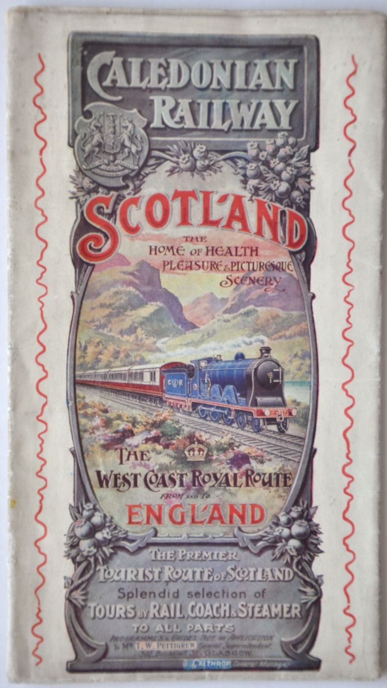 Category: Publicity MaterialCALEDONIAN RAILWAY 24pp fold out brochure "Scotland. The Home of Health, Pleasure and Picturesque Scenery. The West Coast Royal Route from and to England". Coloured pictorial covers showing CR 4-6-0 loco and train against scenic backdrop. Circa 1900s. Small fold tears. £10 | |