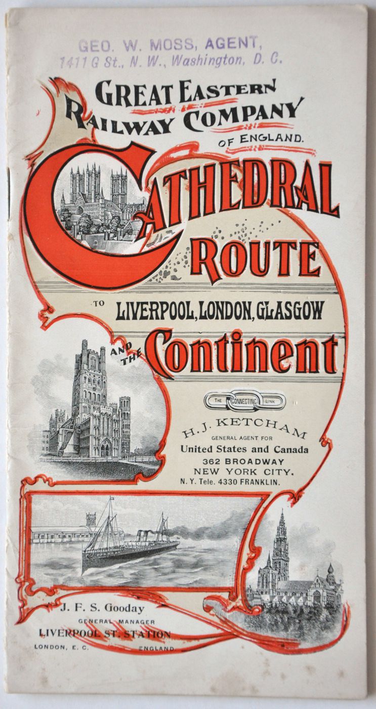 Category: Publicity MaterialGER publicity booklet "Cathedral Route to Liverpool, London, Glasgow and the Continent". 23pp detailing train services and continental connections with fold out map. Coloured pictorial covers show Lincoln & Norwich Cathedrals and company ship. Dated January 1903. £10 | |