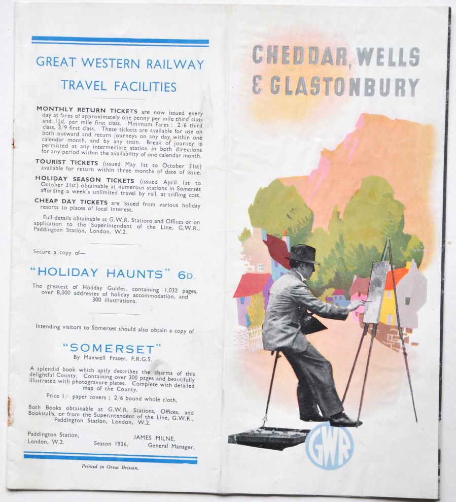 Category: Publicity MaterialGWR 12pp centre folding brochure "Cheddar, Wells & Glastonbury". Coloured artwork and B&W photo pictorial covers showing landscape painter. Dated 1936 season. Staples removed. £10 | |