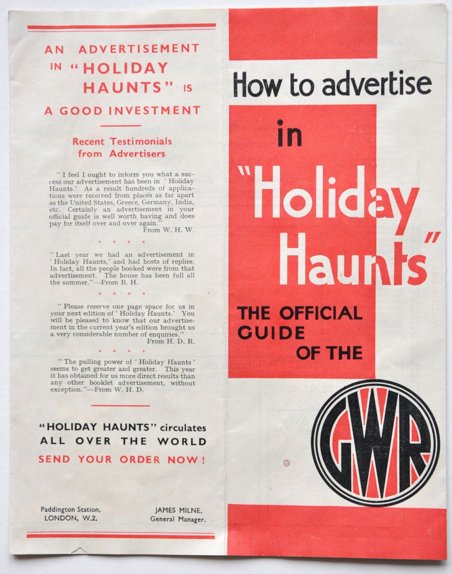 Category: Publicity MaterialGWR 8pp fold out leaflet "How to Advertise in Holiday Haunts". Red and black print with roundel on front. Dated 1933. £10 | |