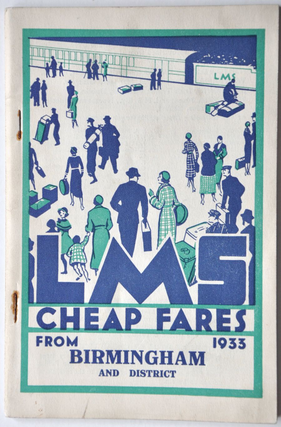 Category: Publicity MaterialLMS booklet "Cheap Fares from Birmingham". Green and blue illustrated covers showing station scene, 76pp dated 1933. £10 | |