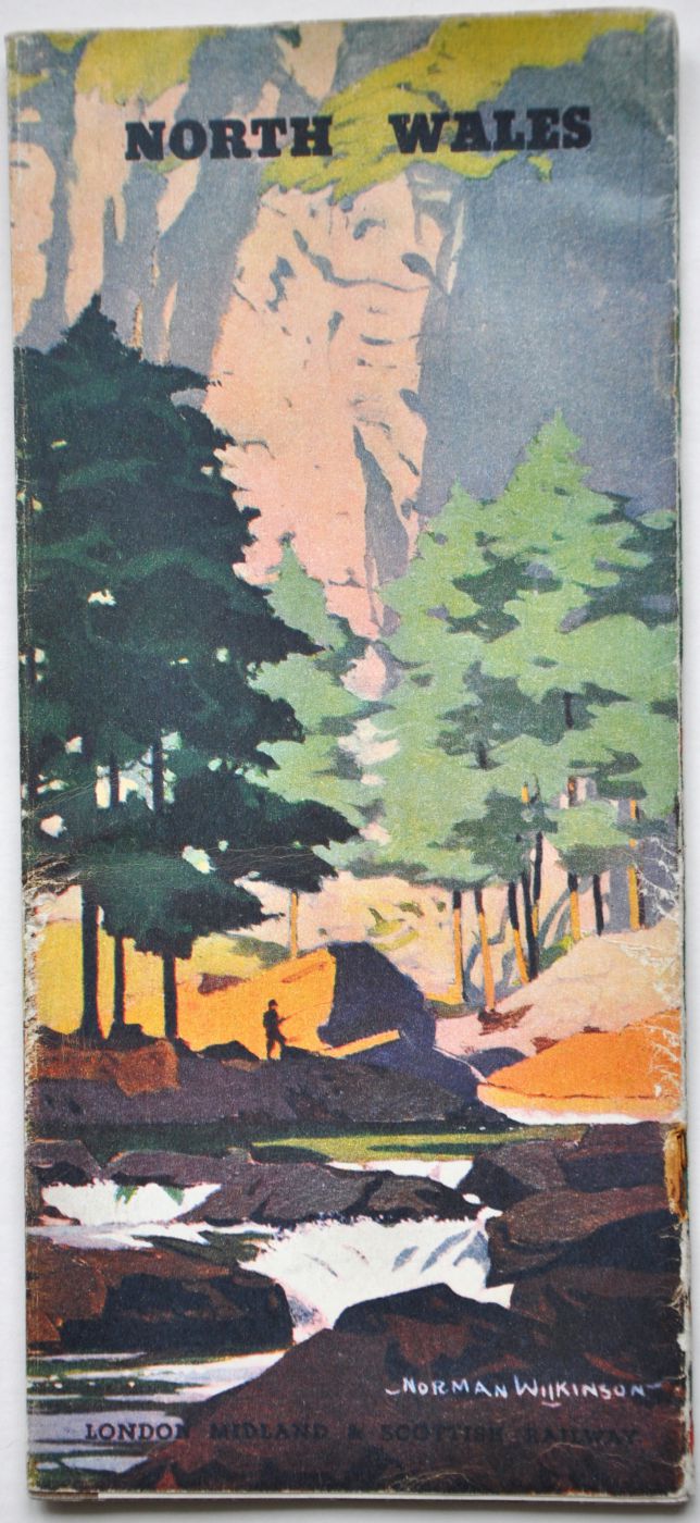 Category: Publicity MaterialLMS centre folding brochure "North Wales". Coloured pictorial covers by Norman Wilkinson showing river and mountains. 24pp illustrated guide to the area circa 1930s. Staples removed. £10 | |