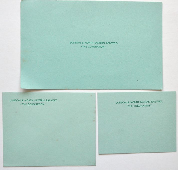 | Lot 342 | Category: Publicity MaterialLNER accessories from "The Coronation" train. Writing paper, card and envelopes, all on light green paper with title in dark green. Unused. (3) £10 |