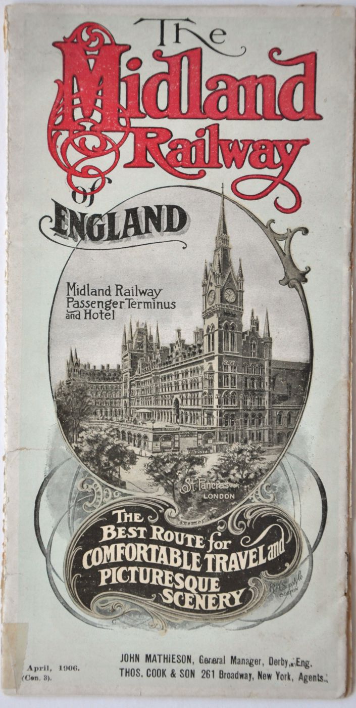 Category: Publicity MaterialMIDLAND RAILWAY OF ENGLAND centre folding brochure "The Best Route for Comfortable Travel and Picturesque Scenery". Illustrated covers showing St Pancras. 30pp dated April 1906. Some wear, tape repairs to rear cover. £10 | |