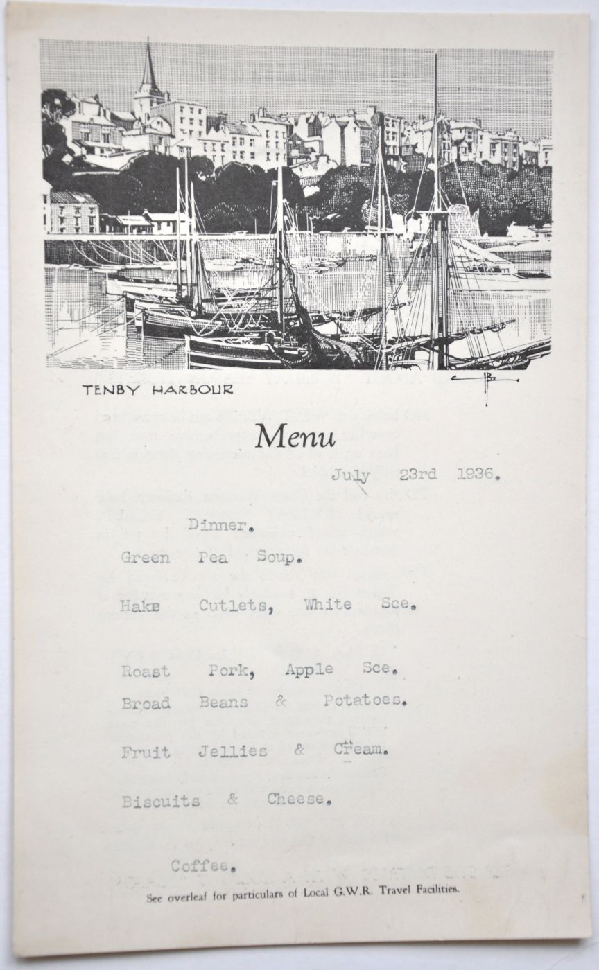 Category: MenusGWR menu. 2pp thin card, front showing Claude Buckle B&W illustration of Tenby Harbour with typed menu below. Map of area 8 runabout ticket on reverse. Dated July 23rd 1936. £10 | |