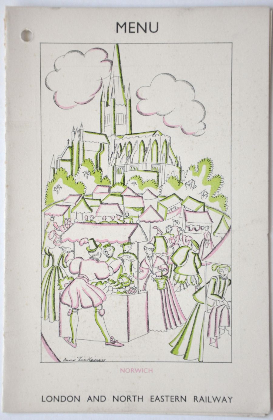 Category: MenusLNER menu and wine list. 4pp with coloured pictorial front showing view of Norwich market and cathedral. Opens to show wine list and luncheon menu for the 12.25pm Liverpool Street - Ipswich train on 5th January 1935. System map on rear. £10 | |