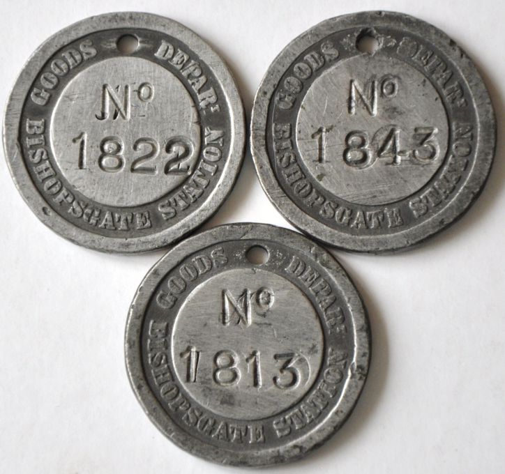 Lot 405 | Category: PaychecksGER paycheck "Bishopsgate Station Goods Depart". Grey metal, 1½" diameter. Plus two others similar. (3) £10 |