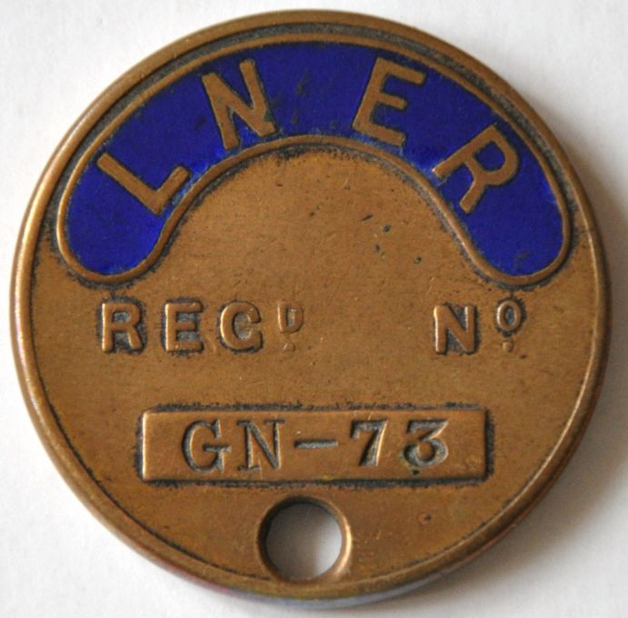 | Lot 406 | Category: PaychecksLNER brass and enamel paycheck type token. 1½" diameter, front showing "Electrical Department" with LNER in blue enamel above. Reverse shows "Regd. No. GN-73" again with LNER in blue enamel. £10 |