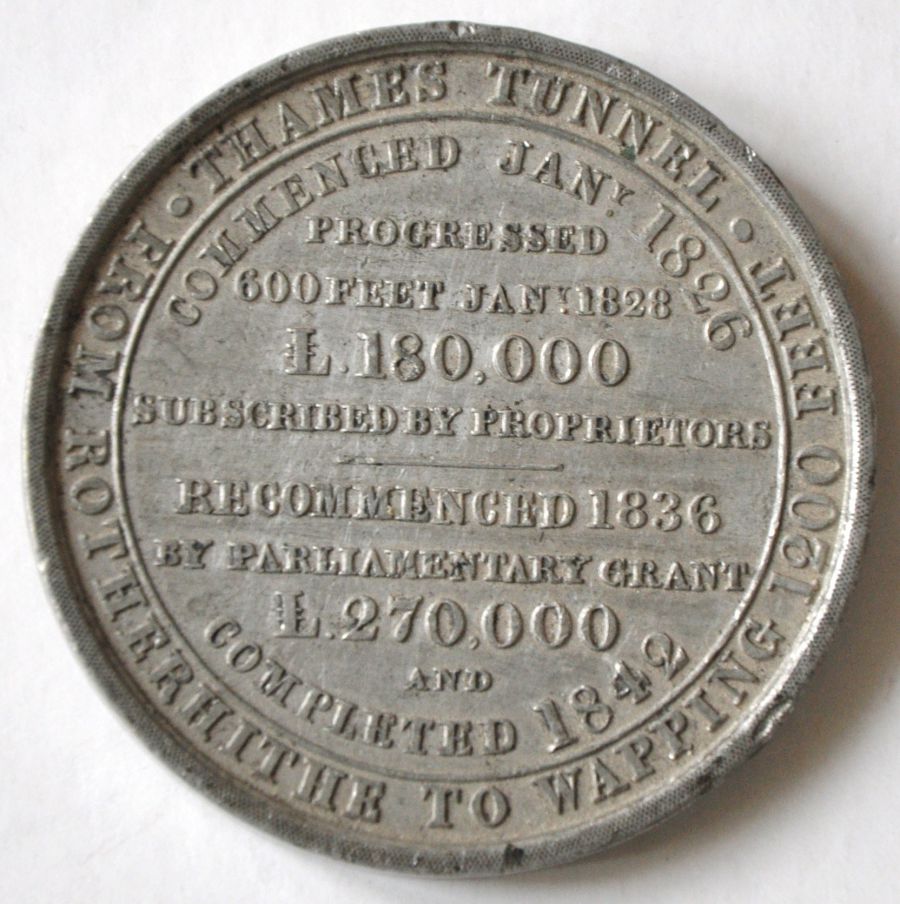Category: MedalsCOMMEMORATIVE MEDAL produced for the opening of the Thames Tunnel in 1845. Front shows details of the costs and delays, rear shows embossed profile of Isambart Marc Brunel. Possibly pewter or gunmetal. 1¾" diameter. £10 | |