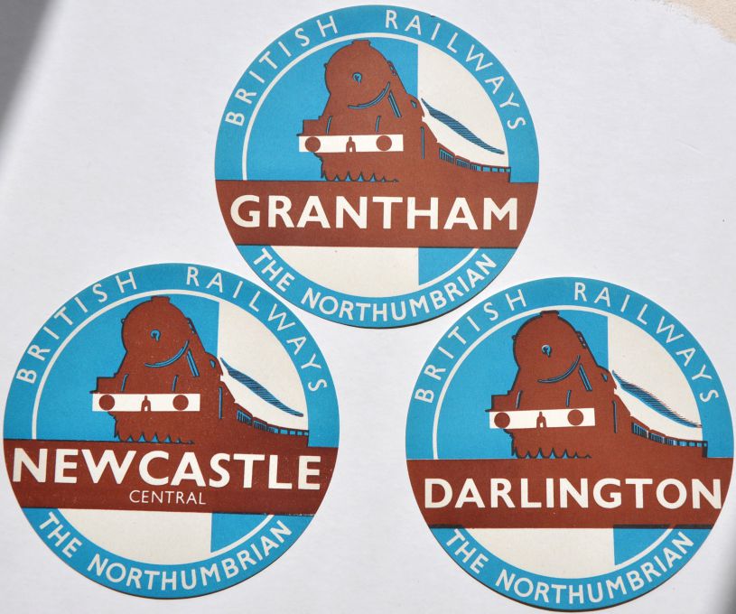 | Lot 421 | Category: Luggage LabelsBR pictorial circular luggage label for "The Northumbrian" to Newcastle Central. Blue and brown colour showing A3 loco and train. Plus similar to Darlington, Grantham. (3) £10 |