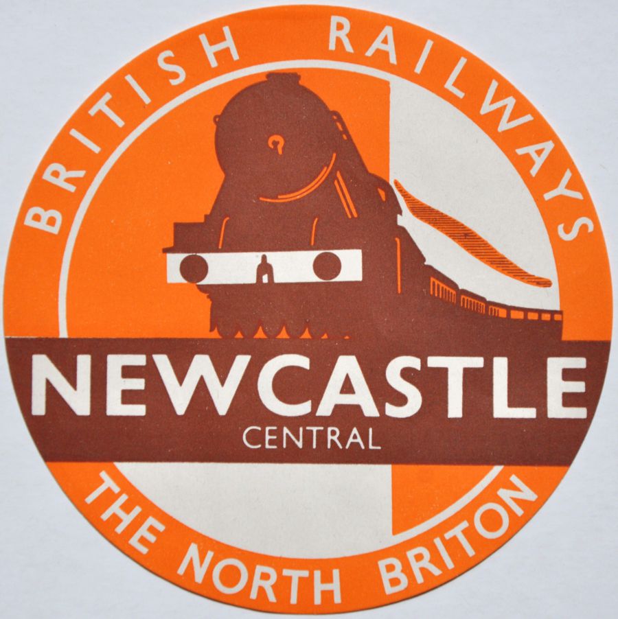 Lot 425 | Category: Luggage LabelsBR pictorial circular luggage label "The North Briton" to Newcastle Central. Brown and orange colour showing A3 loco and train. £10 |
