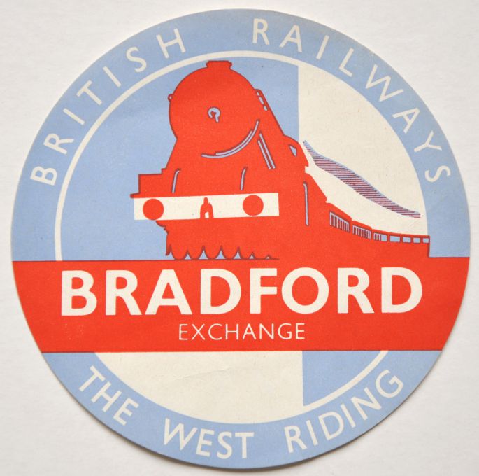 | Lot 429 | Category: Luggage LabelsBR pictorial circular luggage label "The West Riding - Bradford Exchange". Light blue, red and white coloured showing A3 loco and train. £10 |