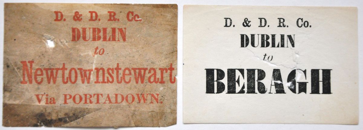 | Lot 460 | Category: Luggage LabelsDUBLIN & DROGHEDA RAILWAY type ID21 luggage label "Dublin to Beragh". Plus similar red print example "Dublin to Newtownstewart via Portadown". Both very poor condition. (2) £5 |