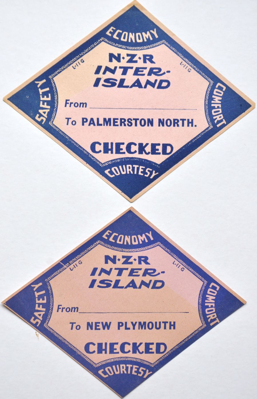 Category: Luggage LabelsTwo NEW ZEALAND RAILWAYS larger diamond shaped labels printed in blue on pink coloured paper for Inter-Island services to Palmerston North and to New Plymouth. (2) £5 | |