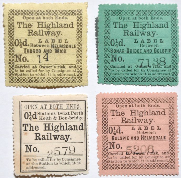| Lot 480 | Category: Parcel and Letter StampsFour HIGHLAND RAILWAY ¼d parcel stamps for "Stations twixt Perth, Keith & Bon-bridge", "Between Helmsdale, Thurso and Wick", "Between Bonar Bridge and Golspie", "Between Golspie and Helmsdale". All on coloured paper and unused. (4) £10 |