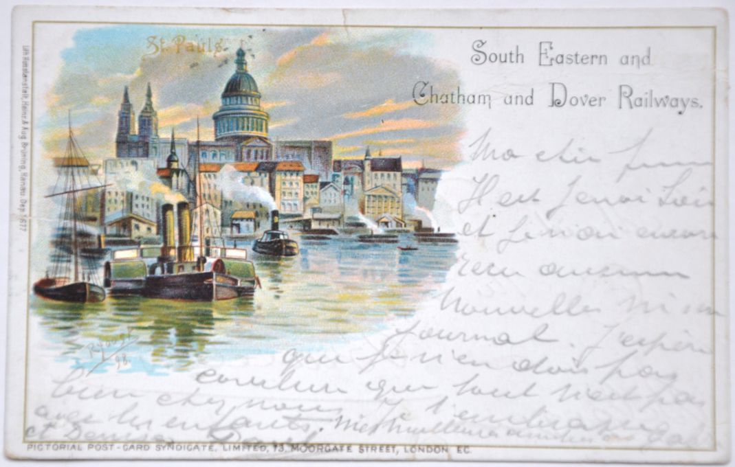 | Lot 488 | Category: PostcardsSOUTH EASTERN & CHATHAM AND DOVER RAILWAYS court sized official postcard "St.Pauls" (SE802) showing colour view from river. UB. Postally used 1900. Scuffs on rear where removed from album. £10 |