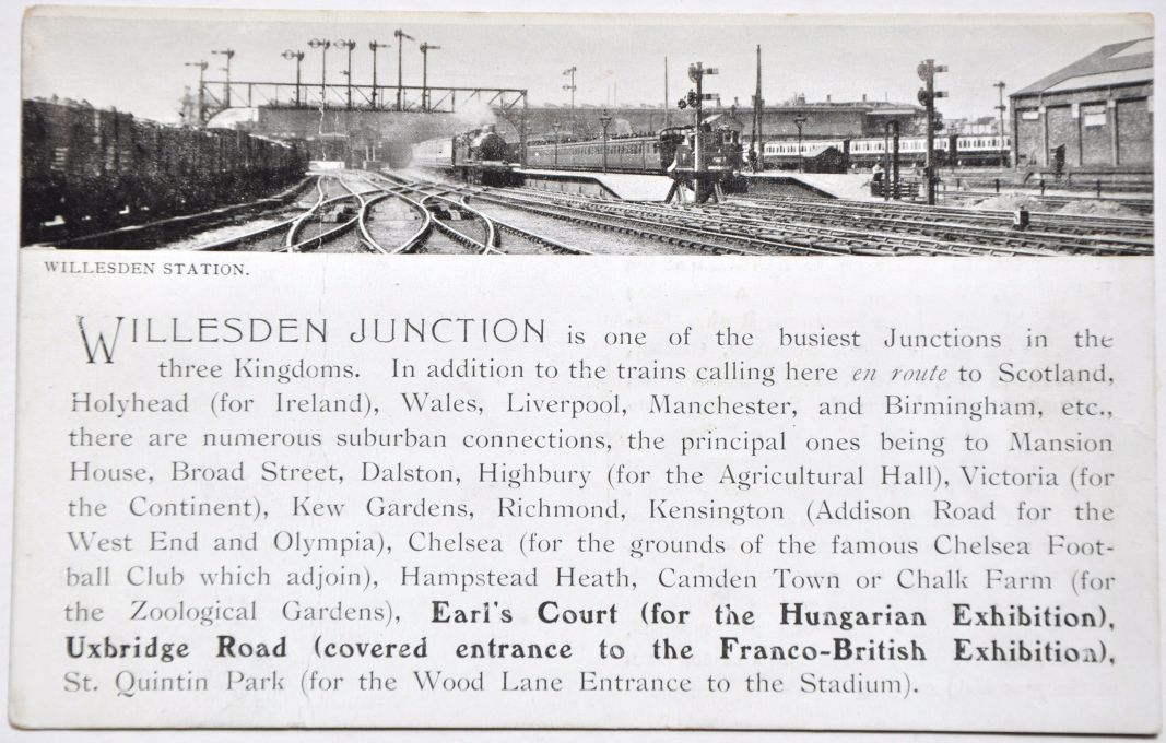 | Lot 501 | Category: PostcardsLNWR official card "Willesden Station" (LSW963) showing strip picture of railway scene at top with info on Willesden Junction and the Hungarian & Franco British exhibitions below. Advert for luncheon baskets on rear. Not postally used. £10 |