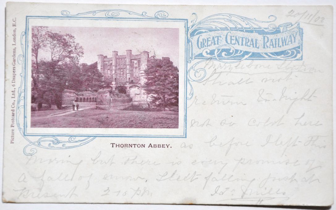 Lot 518 | Category: PostcardsGCR official card "Thornton Abbey" (GC111) showing sepia photo within blue frame. Published by PPC, UB, postally used 1902. £10 |