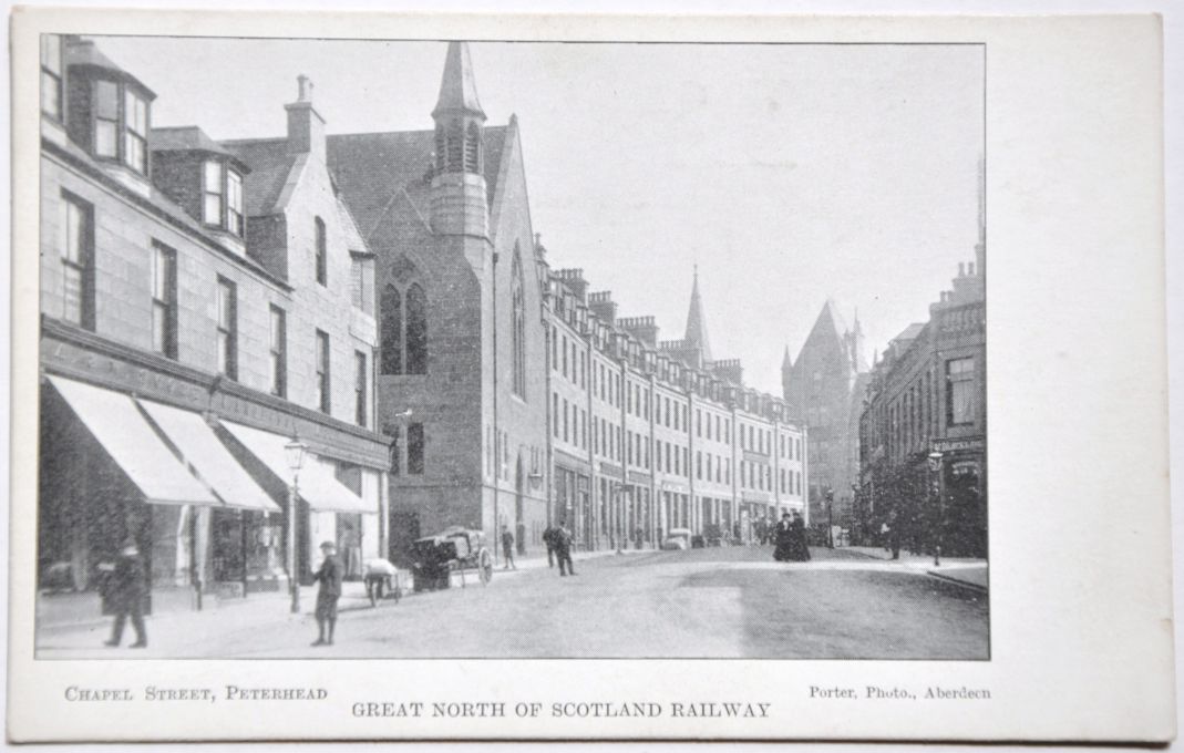 | Lot 522 | Category: PostcardsGREAT NORTH OF SCOTLAND RAILWAY official card "Chapel Street, Peterhead" (GNS022) showing B&W view. Not postally used. £10 |
