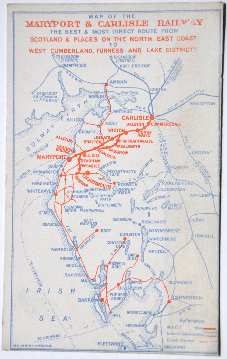 Category: PostcardsMARYPORT AND CARLISLE RAILWAY official map type correspondence card "Map of the Maryport & Carlisle Railway. The best & most direct route from Scotland & places on the North East Coast etc" (MR001). Red and blue print, postally used 1922. £10 | |